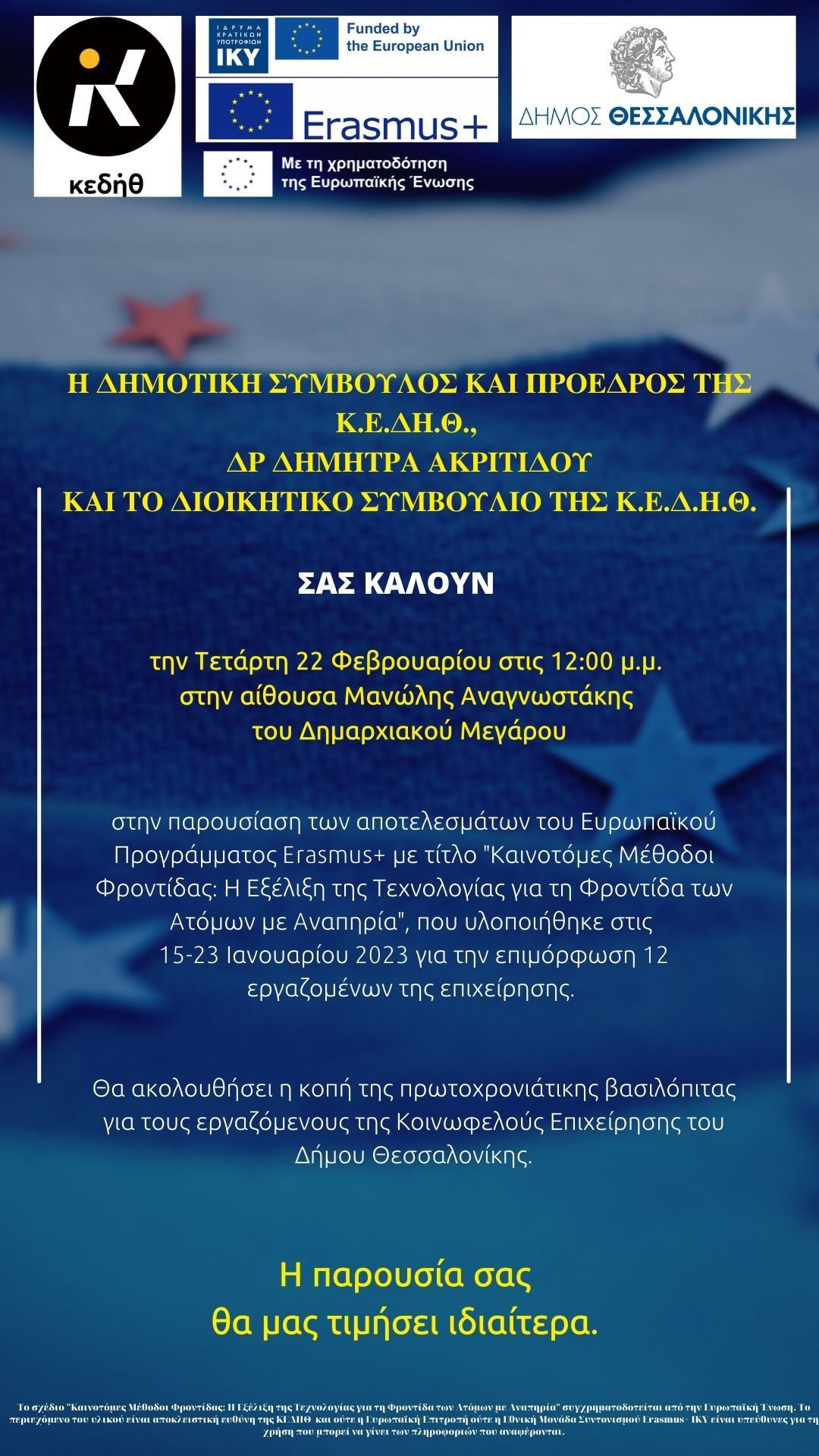 Η Δημοτική Σύμβουλος και Πρόεδρος της Κ.Ε.ΔΗ.Θ., Δρ Δήμητρα Ακριτίδου και το Διοικητικό Συμβούλιο της Κ.Ε.Δ.Η.Θ. σας καλούν την Τετάρτη 22 Φεβρουαρίου στις 12:00 μ.μ. στην αίθουσα Μανώλης Αναγνωστάκης του Δημαρχιακού Μεγάρου στην παρουσίαση των αποτελεσμάτων του Ευρωπαϊκού Προγράμματος Erasmus+ με τίτλο “Καινοτόμες Μέθοδοι Φροντίδας: Η Εξέλιξη της Τεχνολογίας για τη Φροντίδα των Ατόμων με Αναπηρία“, που υλοποιήθηκε στις 15-23 Ιανουαρίου 2023 για την επιμόρφωση 12 εργαζομένων της επιχείρησης.