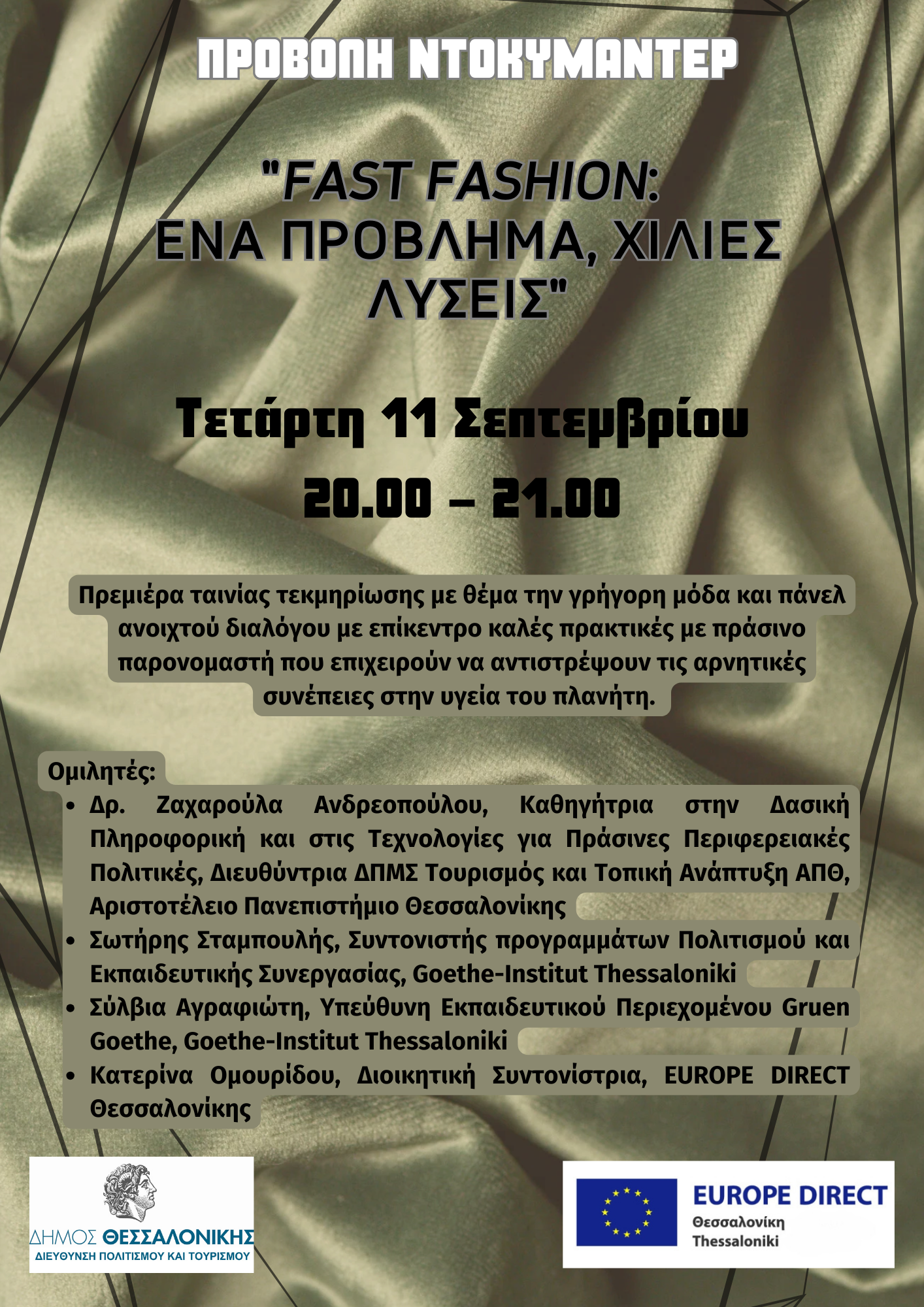 Το Κέντρο Ευρωπαϊκής Πληροφόρησης EUROPE DIRECT Θεσσαλονίκης, με φορέα υποδοχής τη Διεύθυνση Πολιτισμού και Τουρισμού του Δήμου Θεσσαλονίκης, σας προσκαλεί στην Α’ προβολή της ταινίας τεκμηρίωσης ‘Fast Fashion: Ένα...